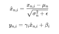 - $\gamma_{i}\beta_{i}$ : 학습 가능한 Scale 및 Shift 이동 파라미터 (BN과 동일)