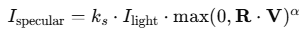 반사광의 세기는 반사 벡터 관찰자 방향 벡터 사이의 내적에 비례하며, 이 값은 광택도 K와 함께 계산된다